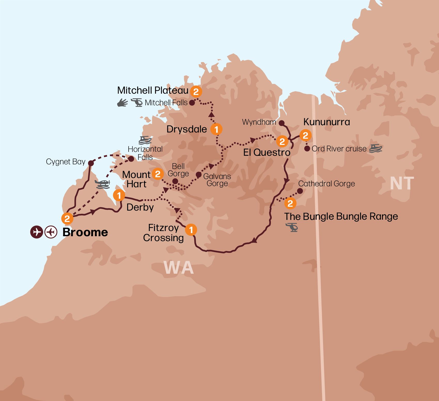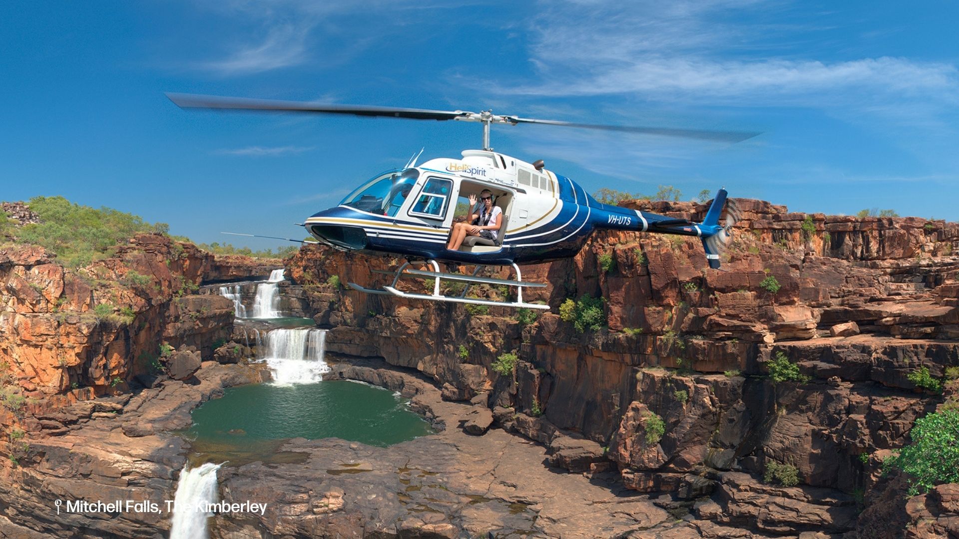 Please Note: For passengers not wishing to do the Mitchell Falls walk there is an option to fly down by helicopter. An Outback Spirit guide will still escort you. The flight cost is $179.00 per person (own expense). Please note: Weight limits apply to all scenic flights