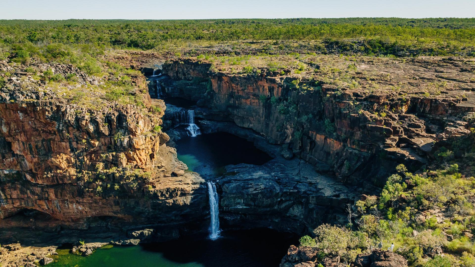 The journey up the King George River is nothing short of breathtaking. The 80-metrehigh sides of the gorge display varying degrees of weathering of the ancient Warton sandstone. Your Expedition Team will escort you to the foot of the twin falls and explain the stunning geological formations of the canyon. B.L.D.
