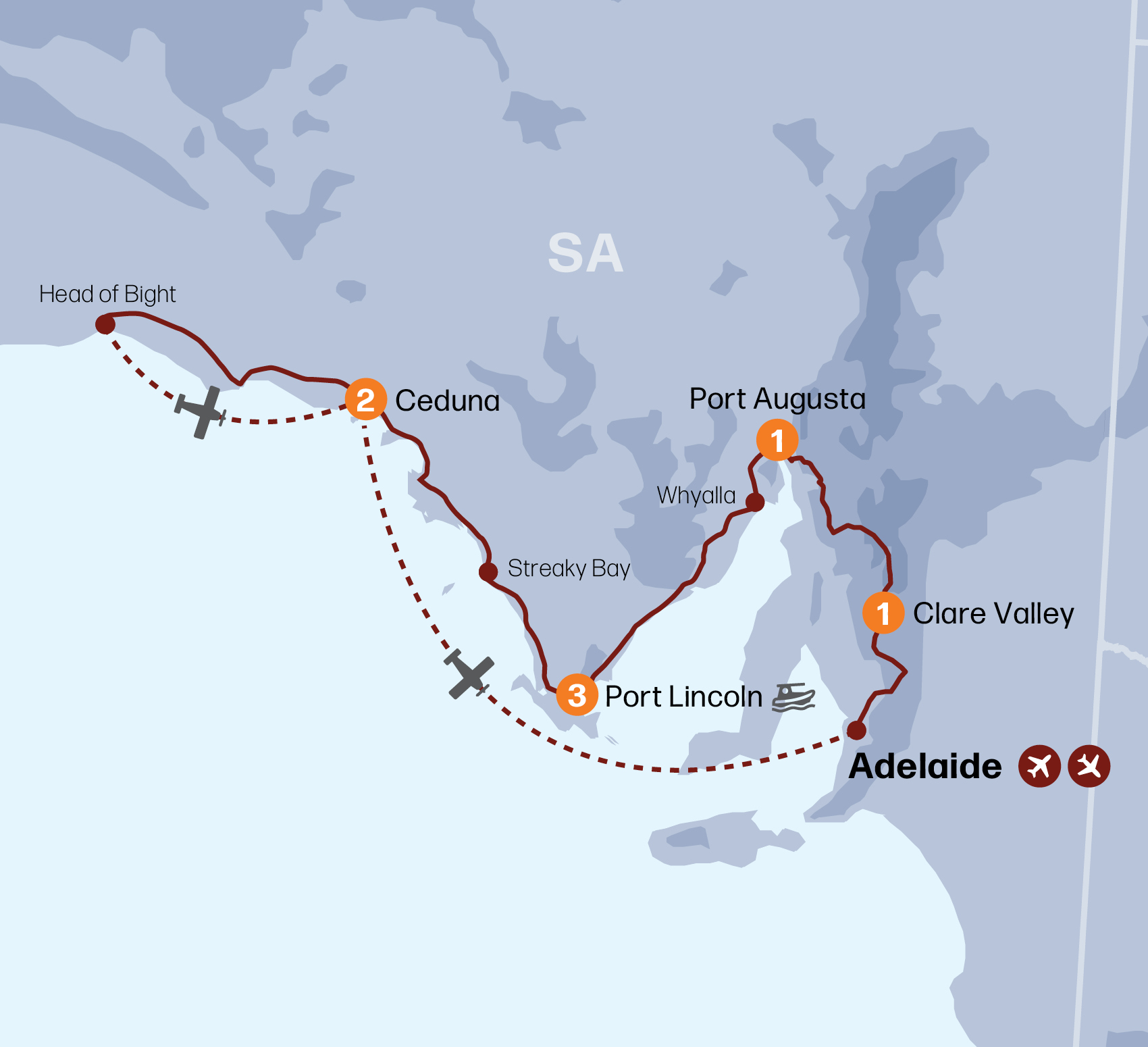 This morning, we say farewell to the Eyre Peninsula and head to the local airport to board our flight with Pel-Air back to Adelaide. Meals: B