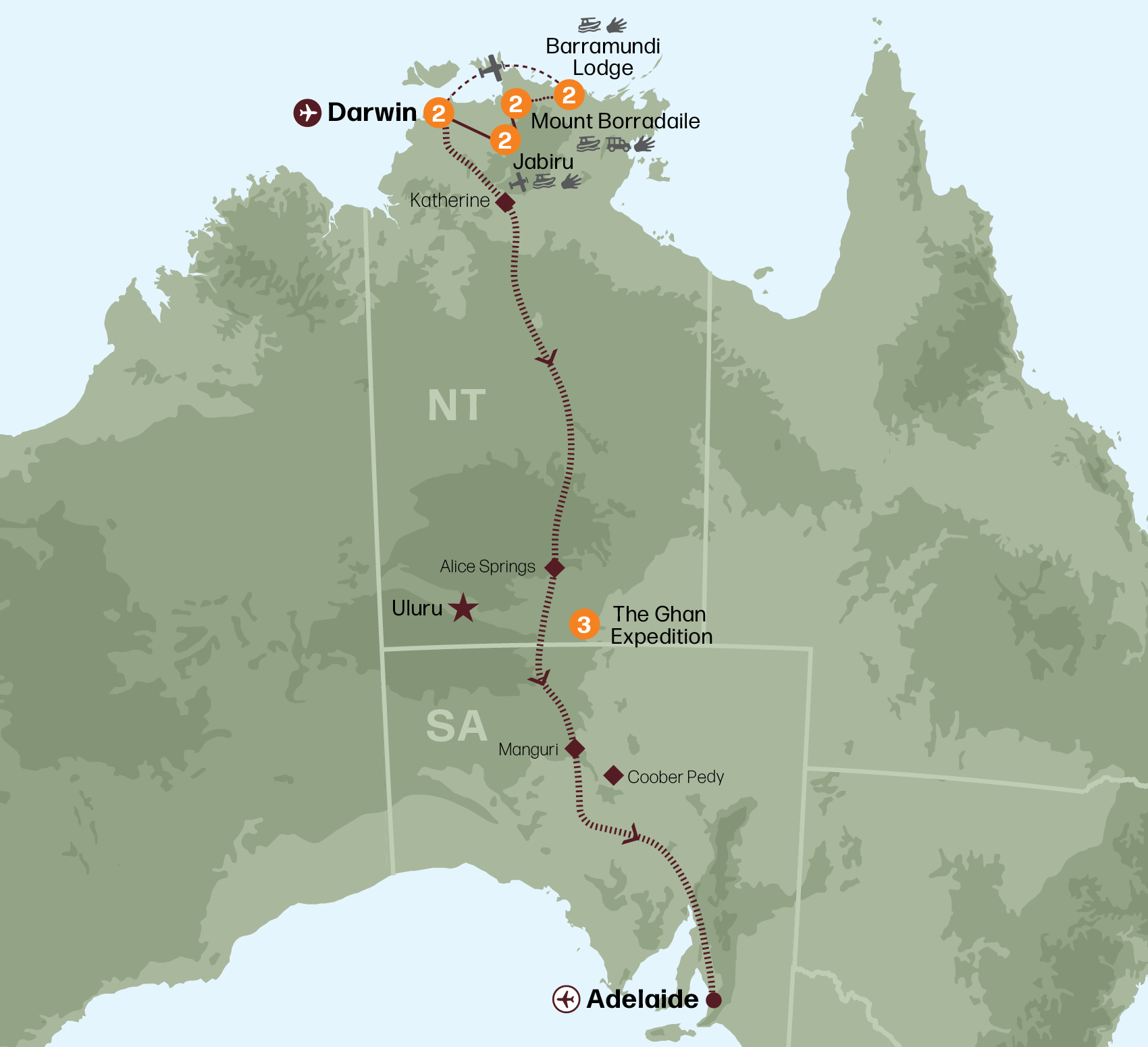 On arrival into Darwin, enjoy a Darwin city tour before being transferred to the Hilton Garden Inn, located on The Esplanade. Gather for a tour briefing, along with dinner at the hotel restaurant. Meals (D)